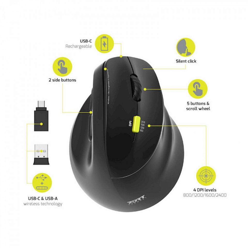RegistracijaErgonomska miška z nagnjeno obliko, izboljša udobje uporabe in zmanjša napetost zapestja in podlakti. Primerna le za desničarje. Opremljena je z brezžično tehnologijo 2,4 Ghz, Bluetooth®, z USB-A, USB-C sprejemnikom in polnilno baterijo ter USB polnilnim kablom. Njegov sistem »plug & play« omogoča hitro in enostavno uporabo. Izkoristite tudi nastavljiv optični senzor za optimalno natančnost: 800/1200/1600 DPI. Združljiva je z operacijskim sistemom Windows in Mac OS. Prevzemite nadzor s 5 tipkami in drsnim kolesom: desni / levi klik, sredinski in naprej / nazaj.