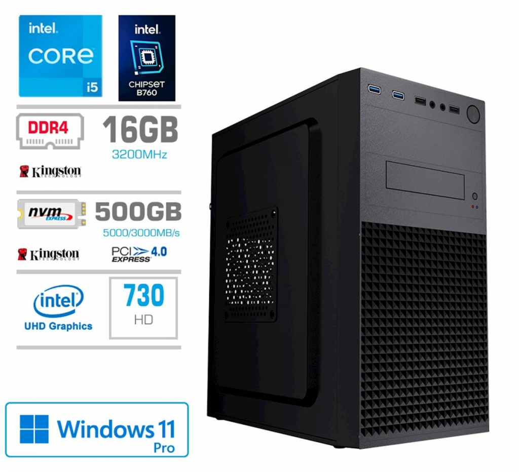 RegistracijaRačunalnik PCX Exam je zasnovan za učinkovito delo z zmogljivim procesorjem Intel i5–14400, hitrim SSD NV3 diskom kapacitete 500GB in napajalnikom moči 450W. Vključuje tudi operacijski sistem Windows 11 Pro in 16GB pomnilnika za gladko delovanje vaših aplikacij.