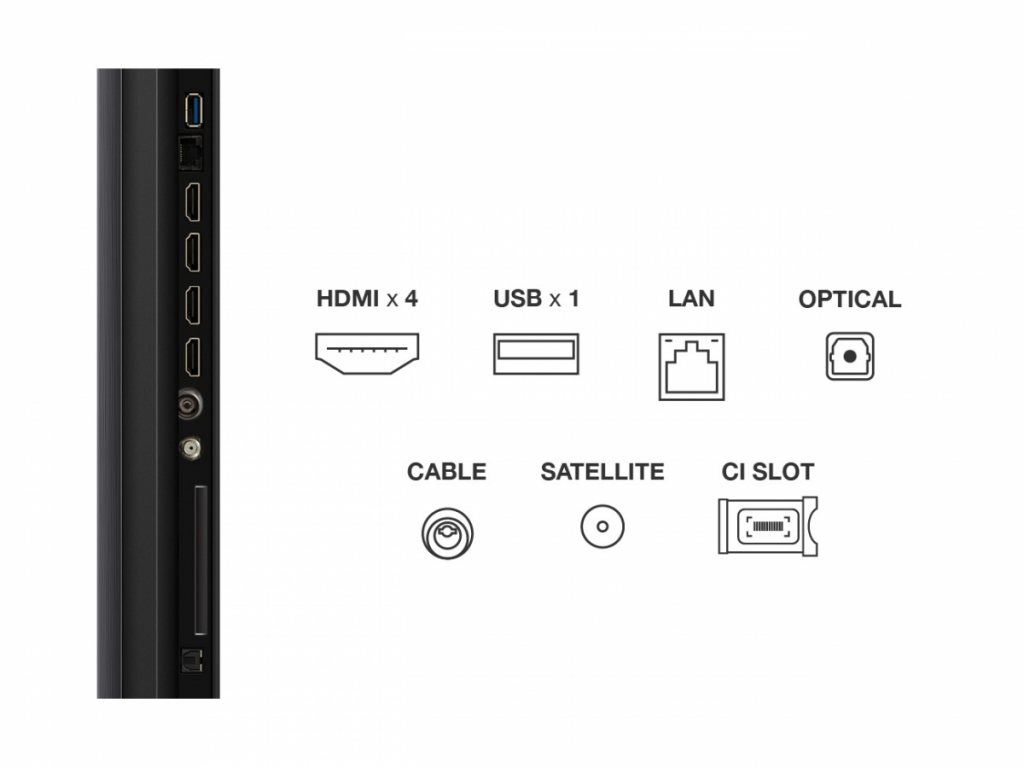 3 × HDMI (1× HDMI 2.1 z eARC + ALLM) 1 × USB Optični digitalni audio out LAN (Ethernet) Antenski vhod