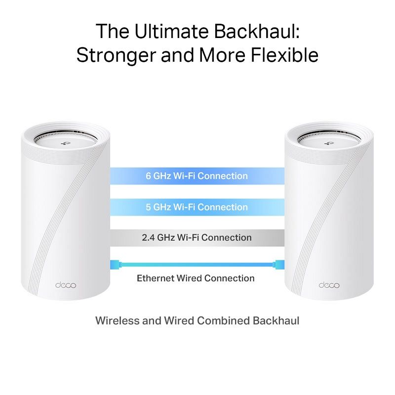 Z našo lastno razvito tehnologijo lahko Deco BE85 hkrati poveže brezžično in žično backhaul z vsako enoto. Še več, z najnovejšo tehnologijo WiFi 7 MLO se poveča pretok kombiniranega brezžič nega in žičnega backhaul omrežja sistema. Na ta način se močno izboljša skupna prepustnost in zmanjša zakasnitev, kar zagotavlja širšo pokritost s stabilnejšimi in zanesljivejšimi povezavami.