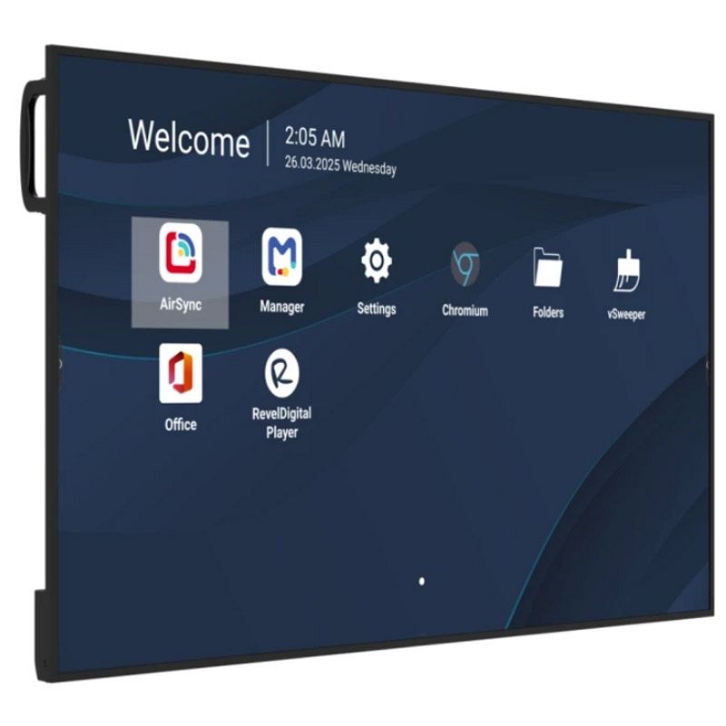 Za neprekinjeno delovanje je zaslon opremljen s funkcijo samodejnega failoverja, ki ob izgubi signala na primarnem vhodu samodejno preklopi na naslednji razpoložljivi vir, kot so HDMI, USB-C ali OPS modul. Poleg tega omogoča predvajanje vsebin neposredno z USB-ja, skupaj z možnostjo razporejanja in samodejnega zagona, kar poenostavi digitalno obveščanje brez potrebe po računalniku. Povezljivost je prilagodljiva: USB-C omogoča prenos slike, podatkov, omrežja in hkrati 65W polnjenje preko enega kabla, HDMI 2.1 vhod in 2.0 izhod pa omogočata podvajanje slike ali povezavo do devetih zaslonov. Brezžično deljenje vsebin je možno prek AirSync, ki podpira AirPlay, Miracast in Chromecast, ter omogoča hitro in varno deljenje zaslona brez dodatne programske opreme.